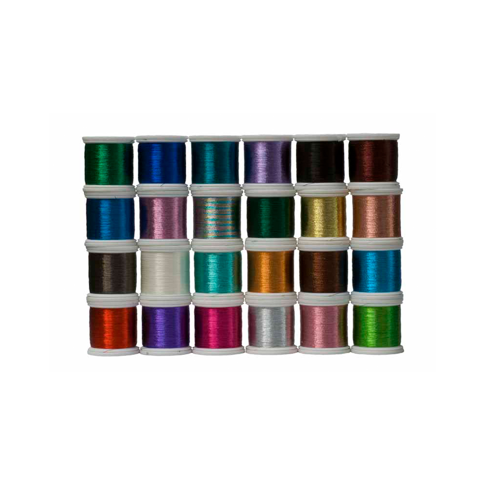 A strong textured polyester filament core with a metalized foil wrap. By finely twisting the foil around the polyester core, this thread achieves a unique shimmering effect that really adds to custom thread wraps. 100 Yds.